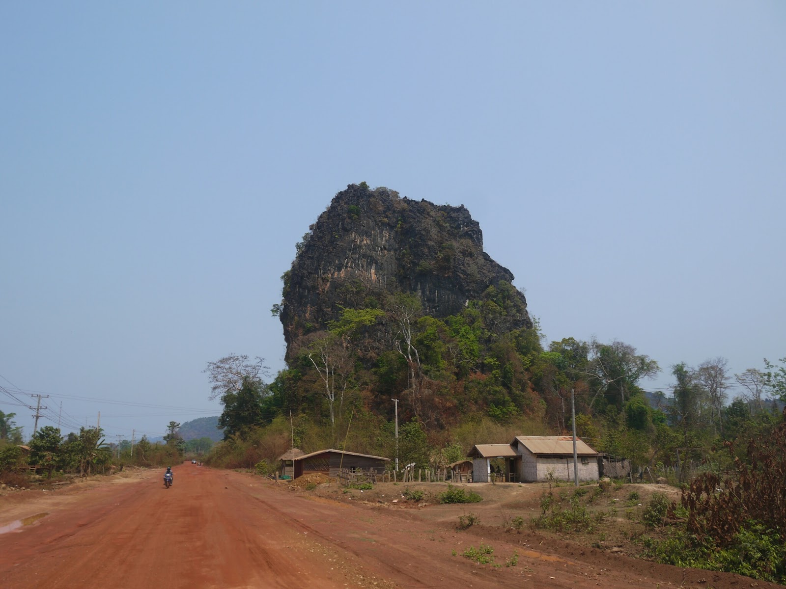 Wenig später ist der Distrikthauptort Bualapha erreicht und sogar Teer, das ist fast zu viel des Guten, aber er hört hinter dem Ort gleich wieder auf. Am Abend ist es angenehm zwischen den ganzen Karstbergen flach dahinzurollen. Leider bricht schon wieder viel zu früh die Dämmerung an und wir suchen uns ein Plätzchen in einem lichten Bambuswäldchen um zu zelten. Wie gestern auch wird eine grosse Portion Reis gekocht, einen Teil heben wir für das Frühstück auf. Am Abend tropft es immer wieder auf das Zelt, unsere Vermutung ist, dass der Bambus wohl eine Flüssigkeit absondert. Als das Tropfen stärker wird, nehmen wir doch an, dass es Nebel hat und daher ab und an ein Tropfen ausfällt. Die Nacht verläuft halb ruhig, man hört auch hier die Bassboxen eines Dorfes vor sich hinwummern.